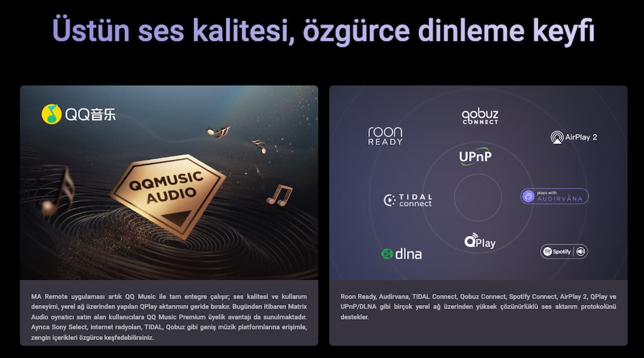 Tidal Connect, Spotify Connect, Qobuz, Roon Ready, AirPlay 2 desteği