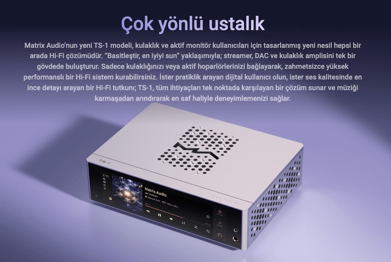 Matrix Audio TS-1, modern Hi-Fi sistemlerin tüm ihtiyaçlarını tek gövdede toplayan üst düzey bir network streamer, DAC, preamp ve kulaklık amplifikatörü çözümüdür. “Simplifying complexity” (karmaşıklığı sadeleştirme) yaklaşımıyla tasarlanan TS-1, hem pratik kullanım hem de yüksek ses kalitesini bir araya getirir.