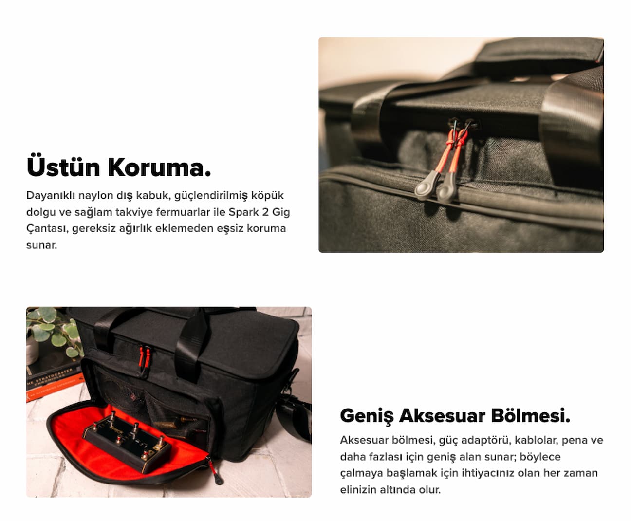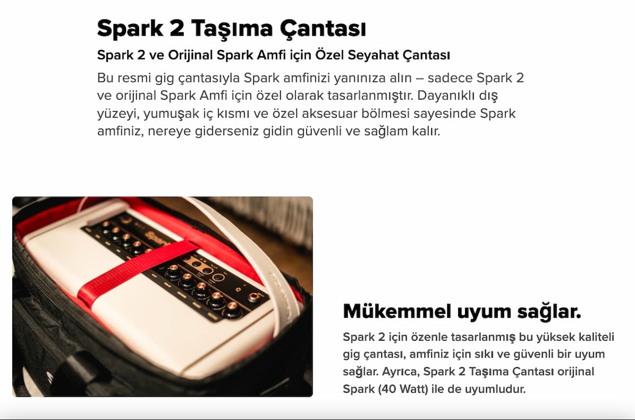 Spark amfinizi her yere güvenle taşıyın. Spark 2 Carry Bag, Spark 2 ve orijinal Spark (40W) amfiler için özel olarak tasarlanmış resmi taşıma çantasıdır. Dayanıklı dış yüzeyi, yumuşak iç kaplaması ve geniş aksesuar bölmesi sayesinde amfinizi her koşulda korur.