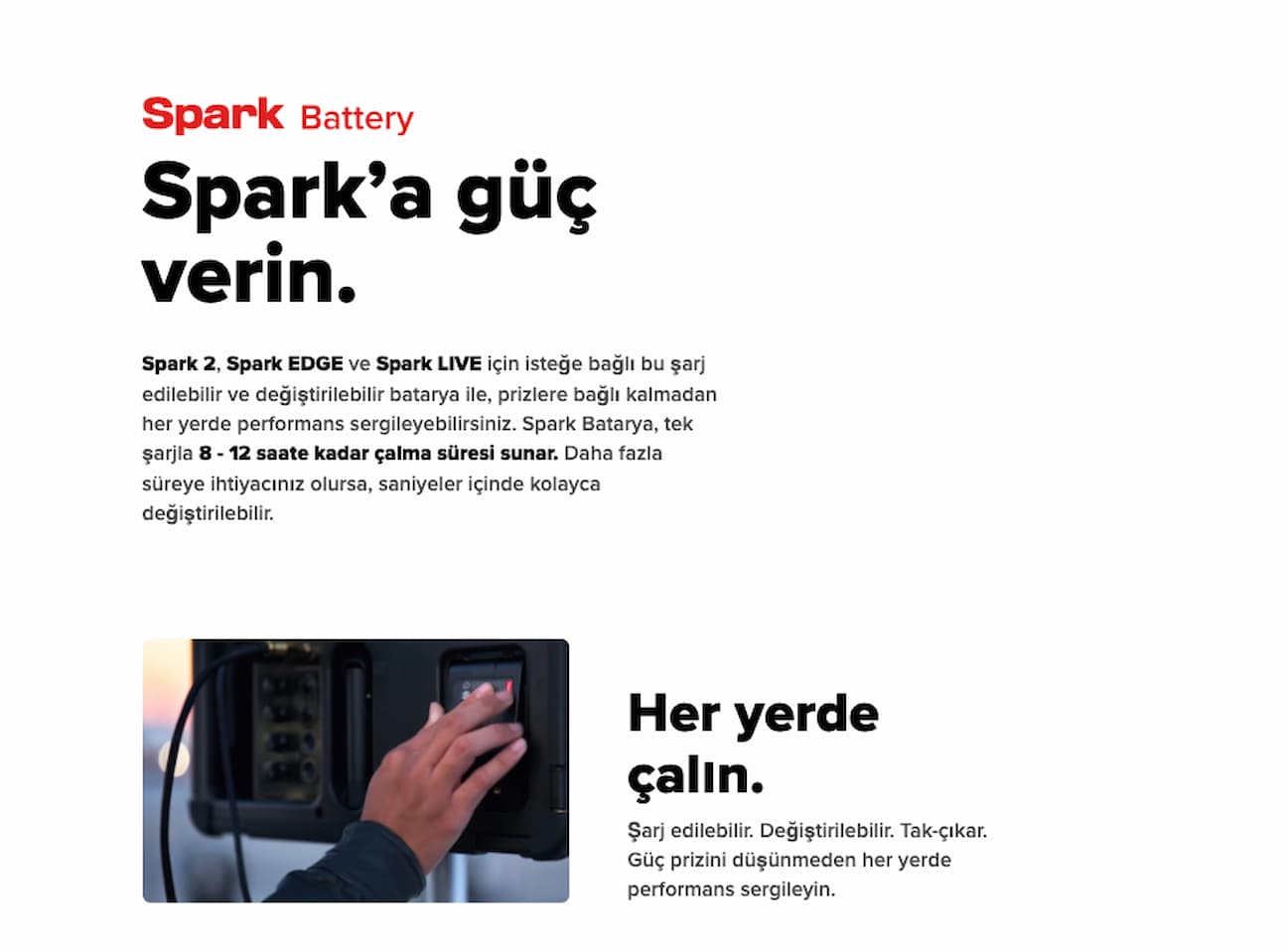 Spark LIVE, Spark 2 ve Spark EDGE için bu isteğe bağlı şarj edilebilir ve değiştirilebilir Batarya ile, elektrik prizine bağlı kalmanıza gerek kalmadan her yerde performans gösterebilirsiniz.