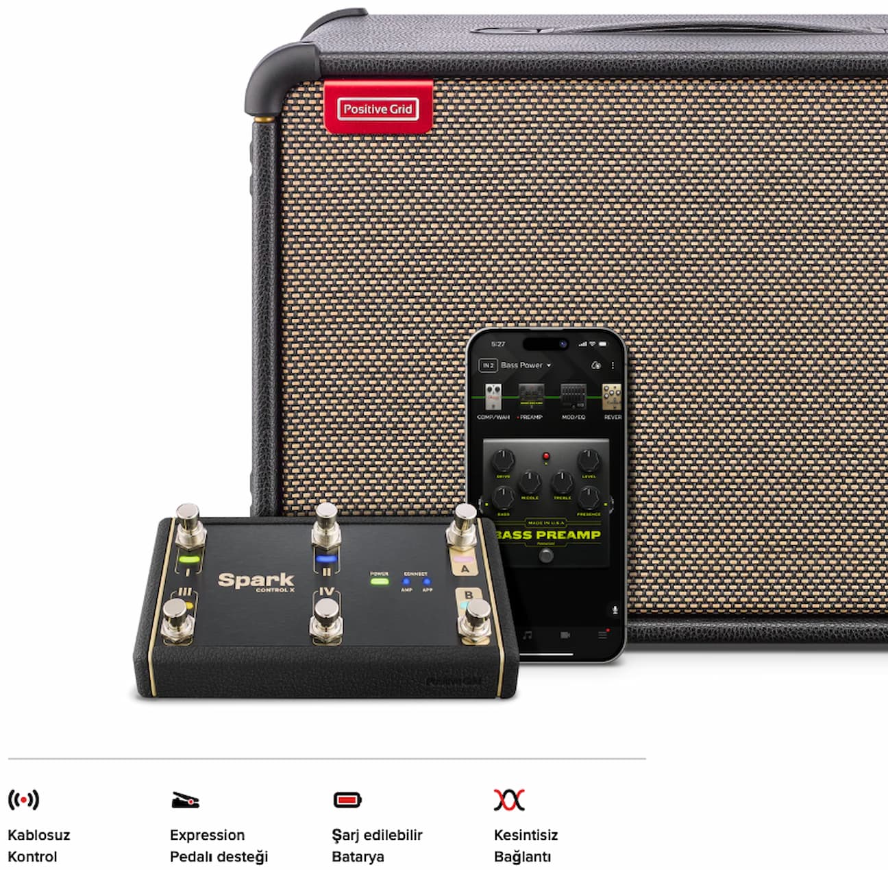 Positive Grid Spark Control X, Spark serisi amfiler için geliştirilmiş kablosuz 6 switch’li ayak kontrollü kontrol ünitesidir. Spark, Spark MINI, Spark GO, Spark LIVE gibi Smart Amp’lerle sorunsuz şekilde çalışarak performansınız üzerinde tam kontrol sağlar. Modern gitaristler için tasarlanan bu ped, preset değişimi, efekt açma/kapatma, Smart Jam ve müzik kontrolünü elde tutmadan yapma imkanı sunar.